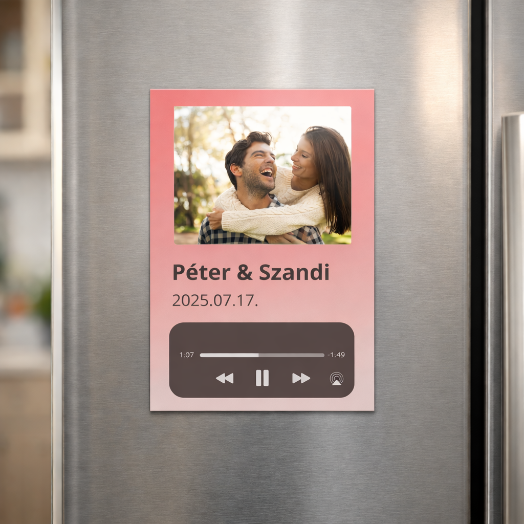 Zenelejátszó stílusú hűtőmágnes – saját fényképpel és felirattal 🎶💖
